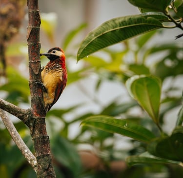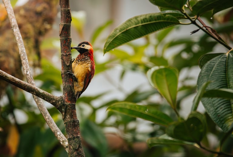 Atento detiene el vuelo entre hojas brillantes del Chocó Andino.